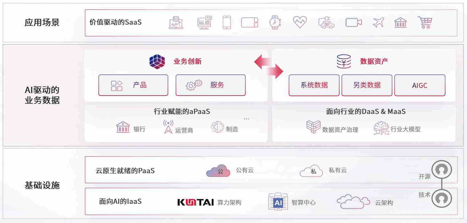数字时代,,,,围绕企业数字化转型的关键要素,,,z6尊龙数码开创性的提出数云融合战略和技术体系框架,,,着力在云原生、、数字原生、、、、AI原生和信创产业上架构产品和服务能力,,,,为处在不同数字化转型阶段的快消零售、、、汽车、、金融、、、、医疗、、政企、、教育、、运营商等行业客户提供泛在的敏捷IT能力和融合的数据驱动能力,,构建跨界融合创新的数字业务场景和新业务模式,,助力企业级客户建立面向未来的核心能力和竞争优势,,,全面推动社会的数字化、、智能化转型升级。。。。